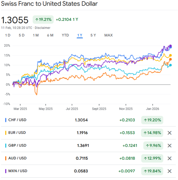 The U.S. Dollar Index (DXY) is down 1.55% year-to-date, following an approximate 8% decline in 2025. While this does not signal a disorderly move, the trend is notable, particularly in light of the dollar’s strength in prior years. Currency movements, however, are rarely uniform. The Swiss franc has appreciated roughly 19% year-over-year, while the euro has gained approximately 15% over the same period. Such divergences highlight how capital is reallocating selectively rather than exiting the dollar indiscriminately.